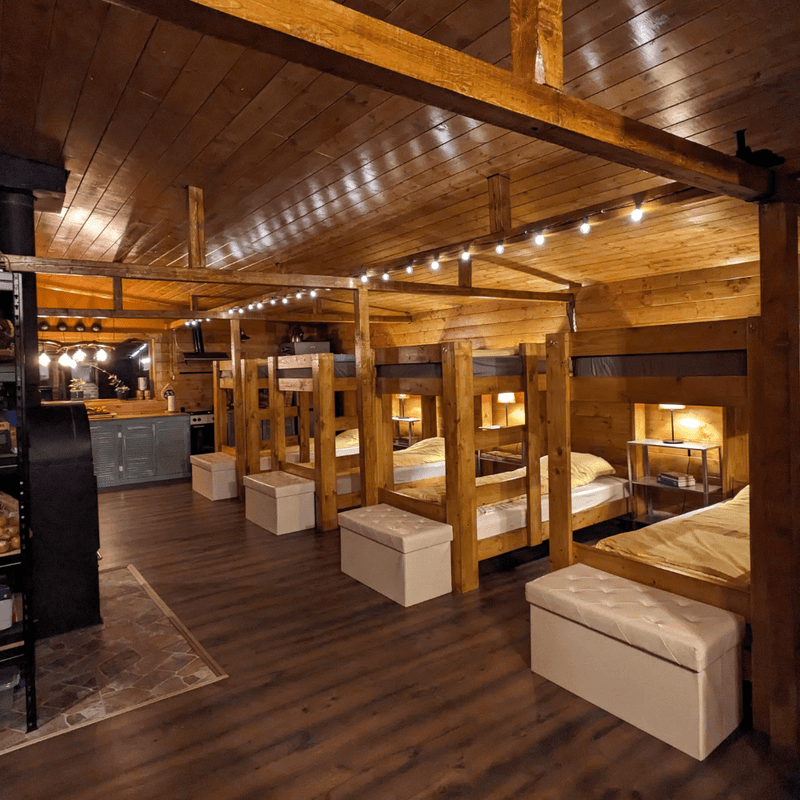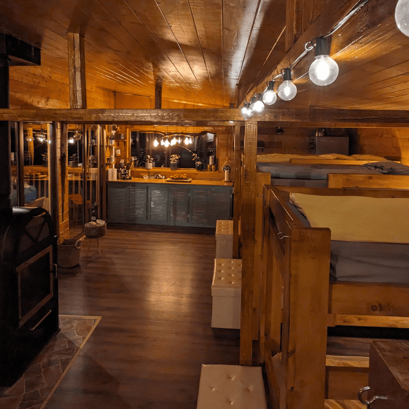 Cabana Carpatin Adventure Camp dispune de un dormitor comun cu opt locuri de cazare, organizate în patru paturi supraetajate, fiecare cu dimensiunea de 2 mx 90 cm, gândiți pentru confort și odihnă după zile active în natură. Spațiul este cald, primitor și realizat integral din lemn, cu iluminare ambientală și zonă individuală de depozitare.