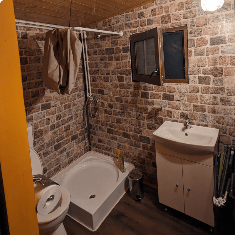 Sunt disponibile două băi, fiecare complet echipată cu toaletă, chiuvetă și cabină de duș (90 x 90 cm), beneficiind de apă caldă și rece. Finisajele sunt simple și funcționale, ușor de întreținut, oferind tot ce este necesar pentru un sejur confortabil, indiferent de sezon.