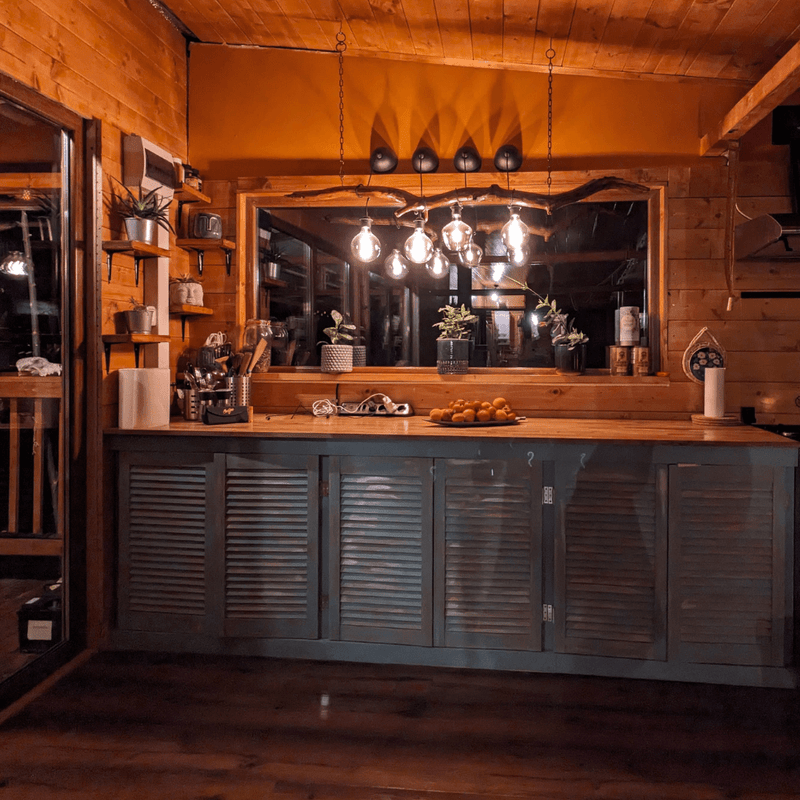 Interiorul cabanei este organizat într-un spațiu deschis de 50 mp, unde bucătăria, zona de luat masa și spațiul de relaxare se completează natural. Bucătăria este completă utilată, ideală pentru mese pregătite în echipă, seri liniștite sau momente petrecute împreună după activitățile din tabară. Zona comună este luminoasă, primitoare și perfect adaptată pentru socializare, jocuri sau planificarea aventurilor din ziua următoare.La exterior, cabana este completată de o terasă generoasă de 40 mp, o spațiu esențial pentru experiența Carpatin Adventure Camp. Terasa oferă loc pentru servirea mesei, relaxare și timp petrecut în aer liber, fiind echipată cu tot ce este necesar pentru a-ți bucura de natură în orice moment al zilei.